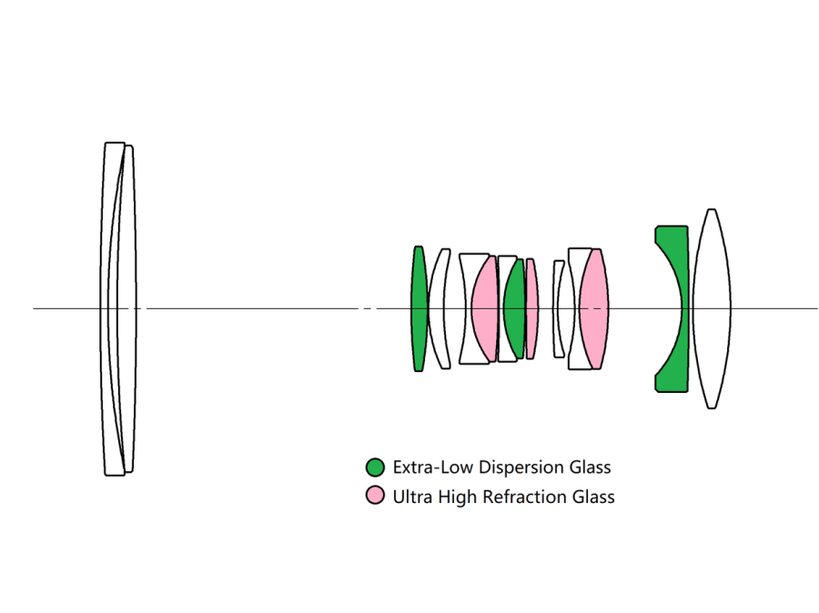 Drei Gläser mit ultrahohem Brechungsindex und drei Linsen mit extrem geringer Dispersion (ED) reduzieren sowohl die chromatische Aberration wie auch optische Verzeichnungen und Geistereffekte auf ein