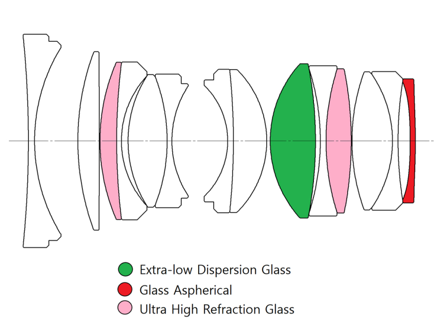 | Optischer Aufbau | 14 Elemente in 9 Gruppen |